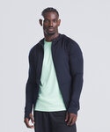 - Contrast melange effect grown on adjustable hood and raglan sleeves.